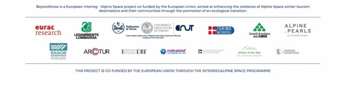 BeyondSnow est un projet Interreg - Espace alpin cofinancé par l'Union européenne. Il vise à réduire la dépendance à la neige des destinations touristiques de l'Espace alpin, à renforcer leur résilience au changement climatique, à maintenir les conditions d’habitabilité pour les habitants et leur attractivité pour les visiteurs.